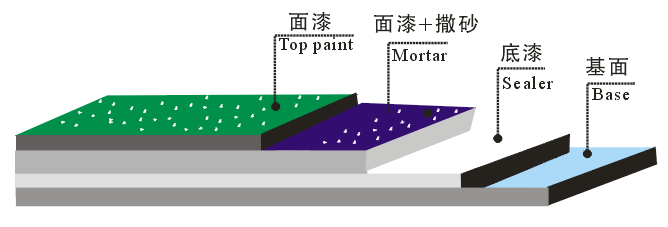 5、表面在滾涂?jī)杀榄h(huán)氧色漆,使之均勻滲透至底層,與石英砂結(jié)合牢固。